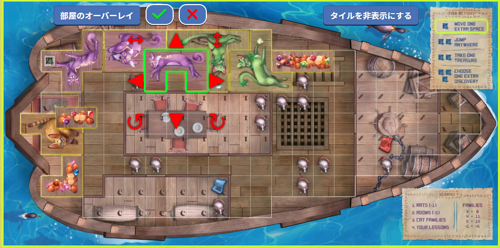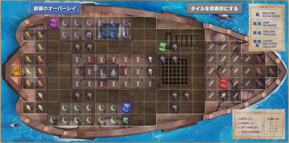 ボートに残ったネズミや、埋まらなかった部屋は減点になるため、いかに効率よくボートを埋められるかが勝負の鍵となります。