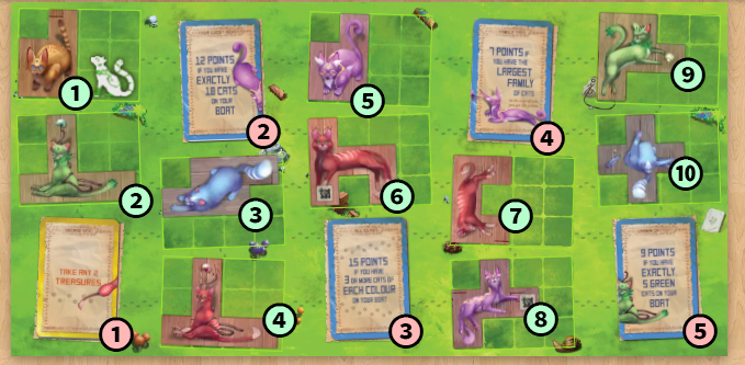 各手番では島にいるネコや宝をボートに乗せ、同色のネコを3匹以上隣接させてファミリーを作ったり、課題カードの目標を達成することで、得点を獲得します。