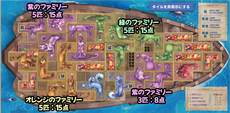 ネコファミリー同色3匹以上の隣接グループがいる場合は、その数に応じて得点を獲得する。