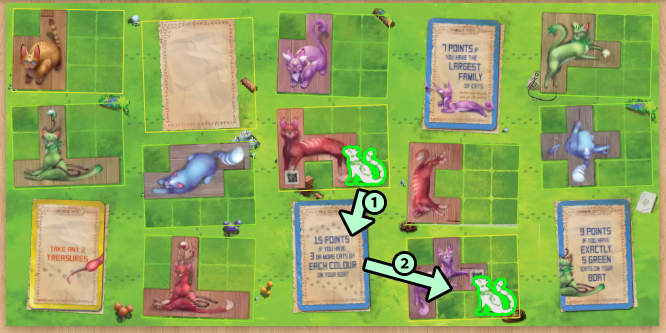 同色のネコタイルを宝マップアイコンの上に置いた場合は、即座に宝タイルを1枚取ってボードに置けます。