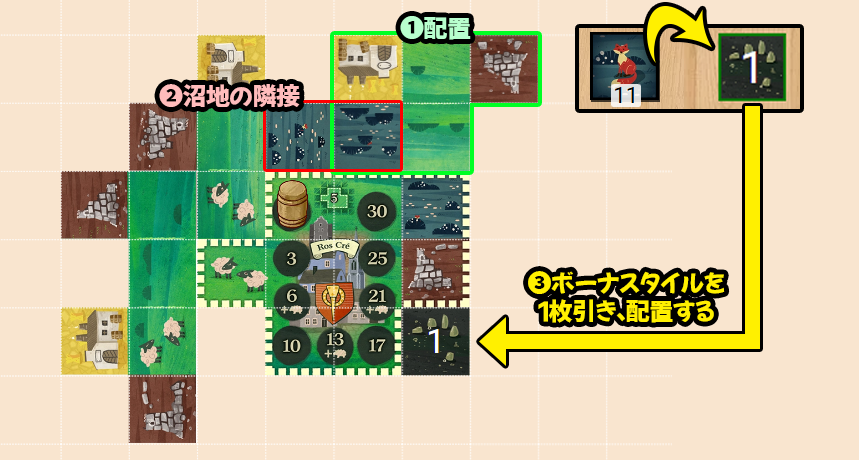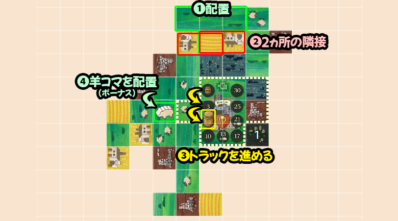 その配置によって新たな効果が発生する場合は、その効果も実施します。羊ボーナス(羊シンボルのタイル)