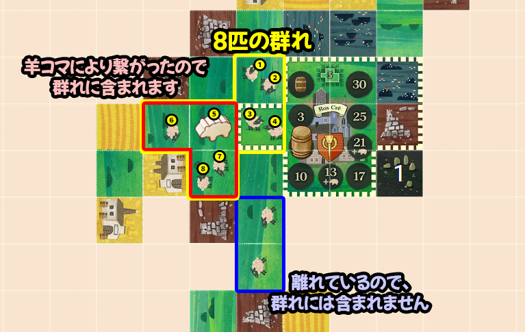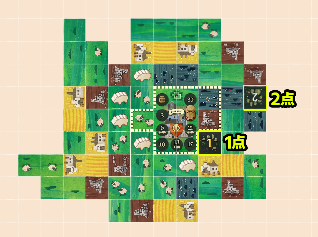 (牧草地がない場合は配置できません)羊コマが置かれた牧草地は羊1匹の牧場として扱います。