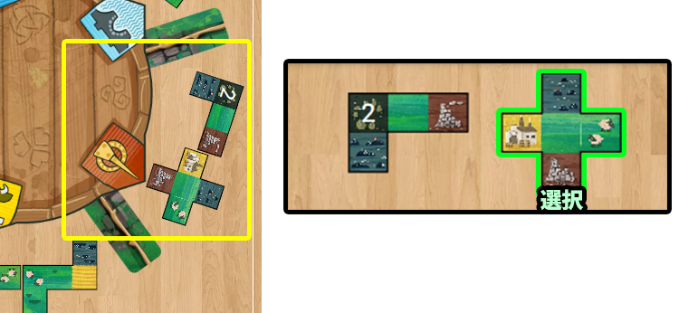 スピナーが止まったとき、自分の紋章が指しているエリア(タイル2枚)が、このラウンドで選択できる範囲になります。