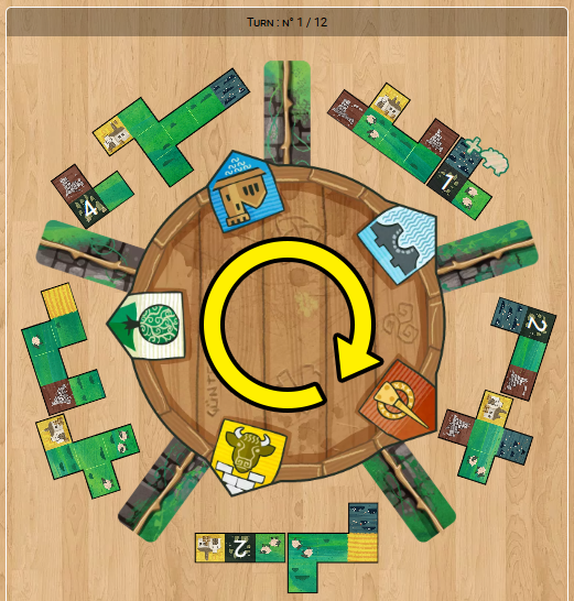 | ❼ | スタートプレイヤーを決定する ランダムでスタートプレイヤーを決め、そのプレイヤーに布袋を渡します。 (このゲームではスタートプレイヤーは補充役となるため、BGAでは関係ありません) |