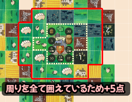 ホームタウンの周囲18マスすべてが埋まっている場合、5点を獲得する。