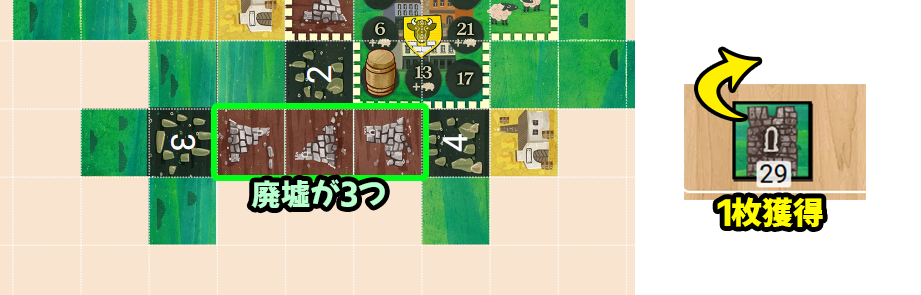 廃墟が縦または横に3つ一直線に並ぶと、塔を1枚獲得します。