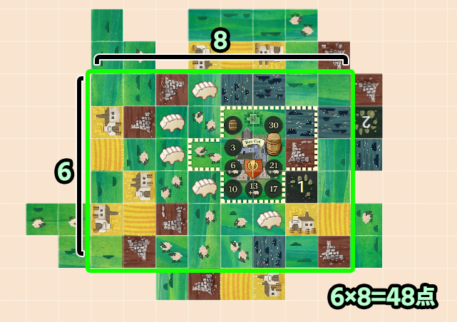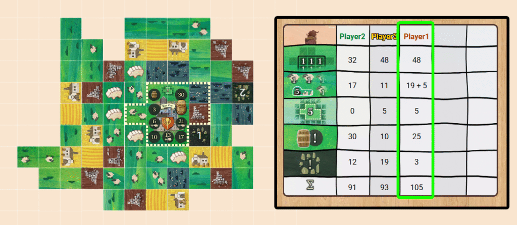 最終的に、最大の長方形エリアや羊、ウイスキーなどの得点を合計し、最も多くの勝利点を獲得したプレイヤーが勝者となります。