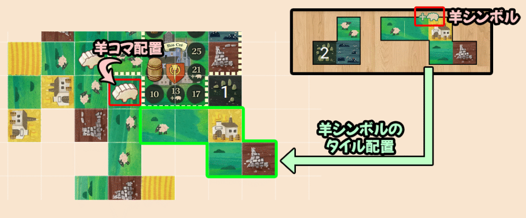 羊シンボルが描かれたマスを含むタイルを配置した場合、羊コマを1個獲得します。