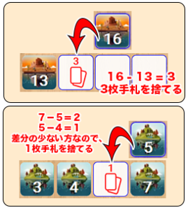 左右両方に隣り合うカードが配置されている場合は、差分の小さい方の枚数を手札から捨てます。