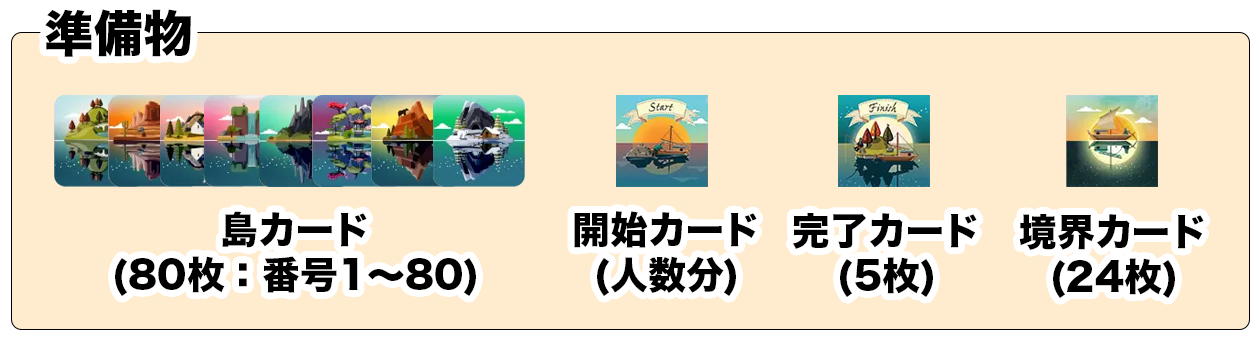 『島カード』と『完了カード』を全て加えてシャッフルし、プレイヤーごとにできるだけ均等に配って山札を作成。