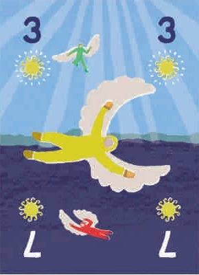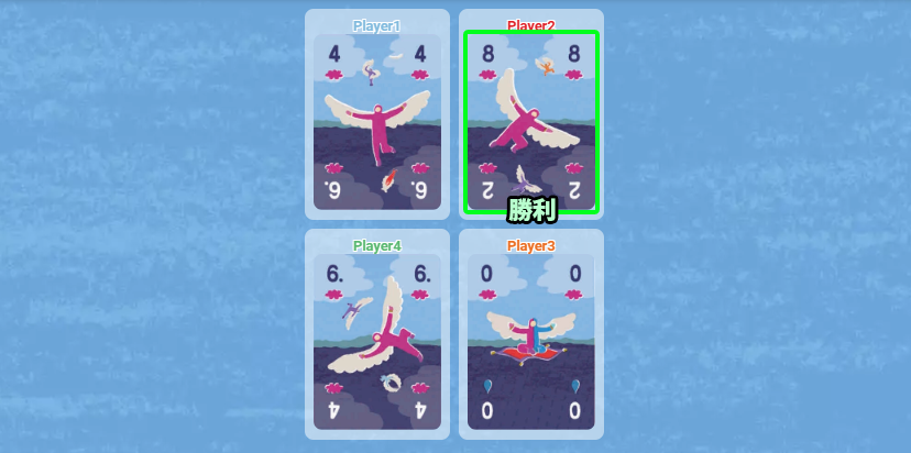 トリカロスは、空を自由に飛ぶことに憧れたイカロスたちが、太陽を目指して舞い上がる――そんな神話的な背景をモチーフにしたトリックテイキングゲームです。