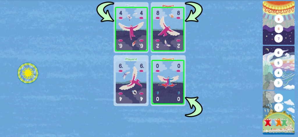ゲーム開始時は通常ルールと同様に進行し、トリックに勝利したプレイヤーは太陽に向かって進みます。