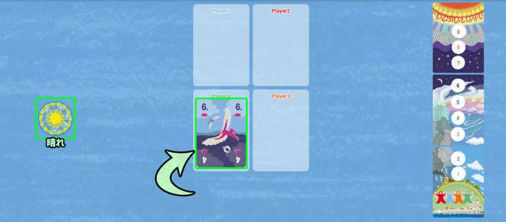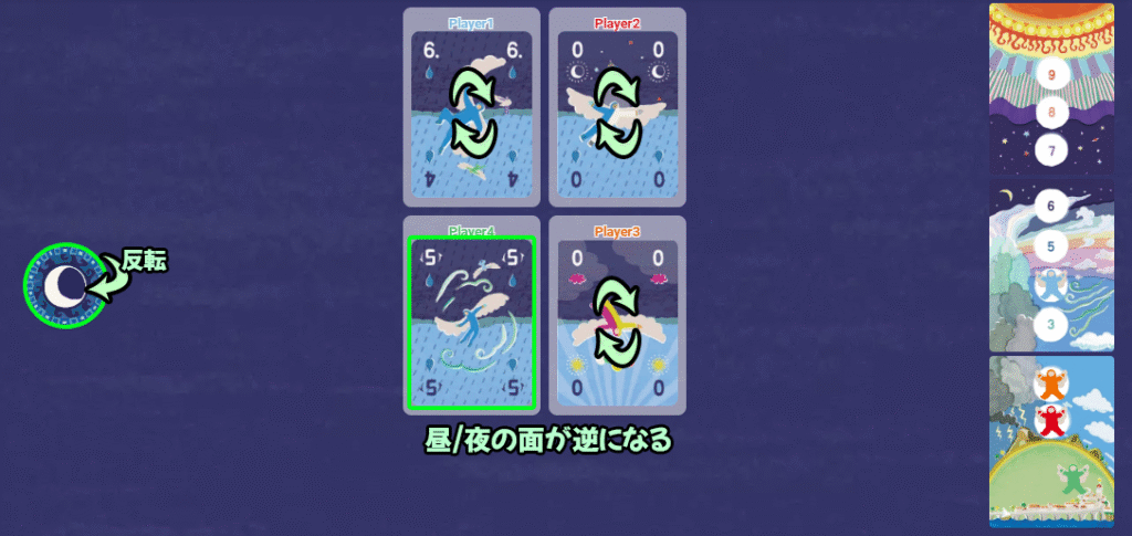 昼と夜で変化する切り札や、場を反転させるカード、勝者に不利な効果をもたらすイナズマカードなどを考慮しながら、どのトリックに勝つかを見極めることが勝利への鍵となります。