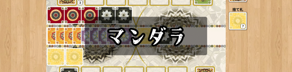 『マンダラ』は、2人で色カードを出し合いながら得点を集めていくカードゲームです。中央には2つのマンダラがあり、プレイヤーは自分の手番でカードを出すか、場のカードを獲得します。