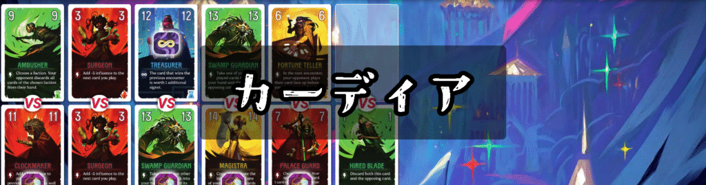 『カーディア』は、2人で対戦するスピーディなカードゲームです。各プレイヤーは16枚の同じデッキを持ち、毎回1枚ずつカードを同時に出します。
