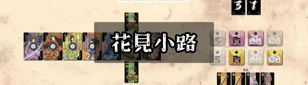 『花見小路』は、京都の花街を舞台に、限られた選択肢の中で相手と読み合う2人専用カードゲームです。プレイヤーは芸妓カードを巡って競いますが、1ラウンドで行える行動は4種類のみで、それぞれ1回ずつしか使えません。
