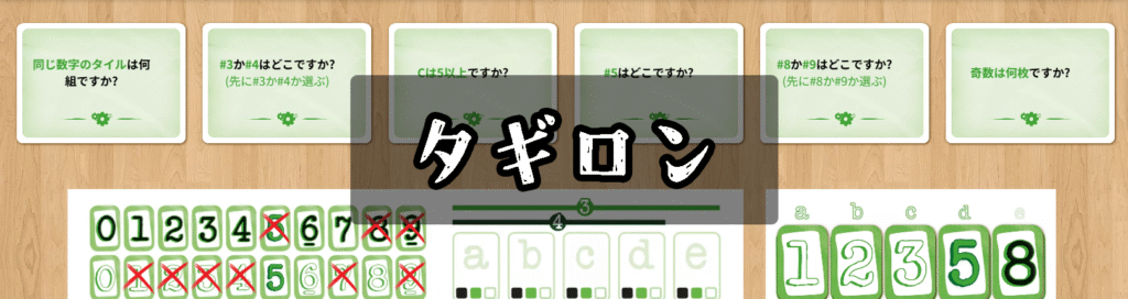 『タギロン』は、2~4人で遊ぶ論理推理ゲームです。各プレイヤーは、色と数字で構成された自分だけの秘密のコードを持ち、手番では質問カードを使って「特定の条件を満たす色や数字はいくつあるか」といった情報を公開していきます。