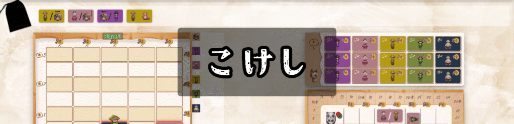 また、獲得した業績や動物トラックの進み具合が最終得点に影響し、どのこけしを優先するかの戦略性が濃厚。シンプルなルールながら、成長の手応えと多彩な選択が楽しめるゲームです。