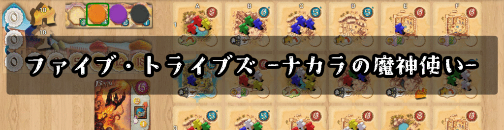 『ファイブ・トライブズ:ナカラの魔神使い』は、マス目に配置されたミープルをマンカラ方式で移動させ、止まった先の効果を活用して得点を競う戦略ゲームです。