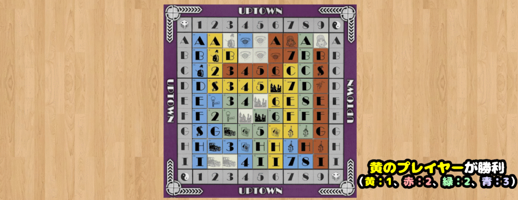 ゲーム終了時に、自分のタイルが形成するグループ数が最も少ないプレイヤーが勝利します。