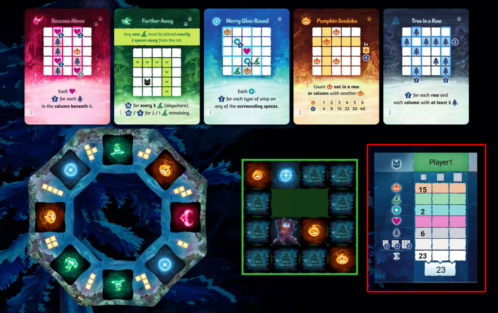 プレイヤーは池に集まったウィスプタイルを取り、指定された形になるように木タイルと組み合わせて森へ配置していきます。ハート、オーブ、ジャック、ウィッチといったウィスプの種類や配置の仕方によって得点条件が変わり、目標カードを満たすことで得点を獲得できます。