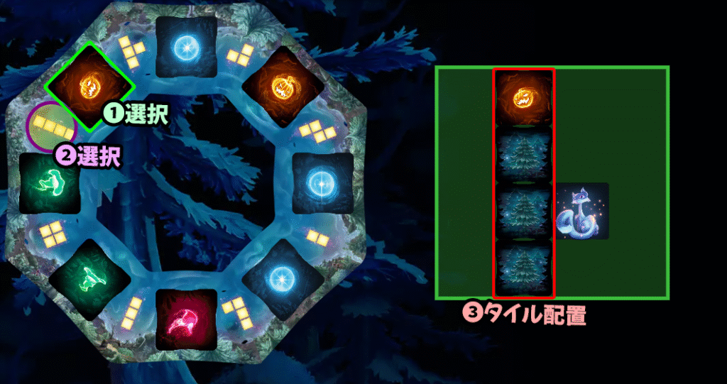 | ・ | 選んだ形で配置 選んだウィスプタイルと木タイルを組み合わせ、選択した形になるように配置します。 |