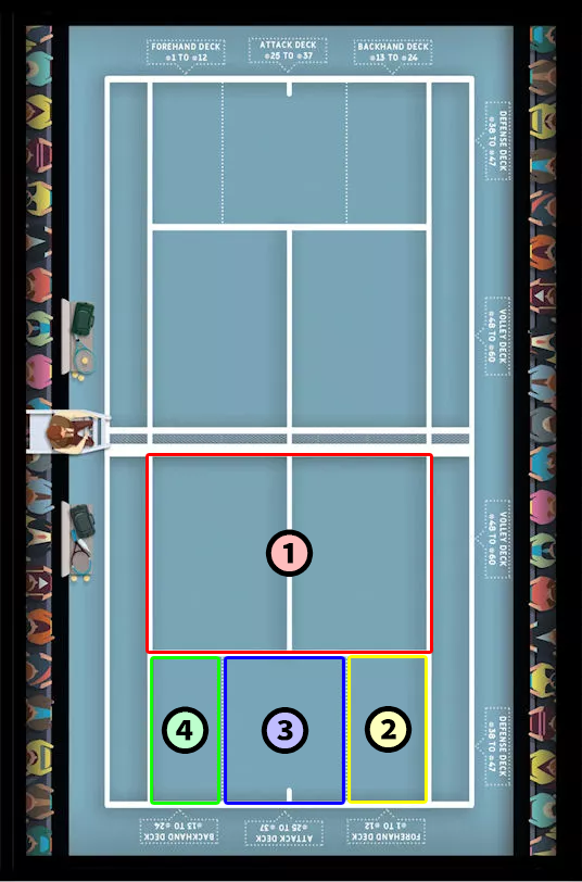 - ボールを受け取る際にバックコートのどちらかの側にいて、反対側に移動する必要がある場合、手札から1枚のカードを捨てる必要があります。