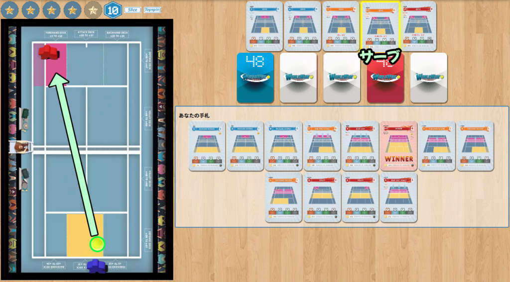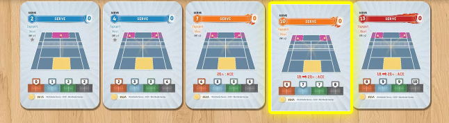 次に、前に置かれたサーブカードのうち1枚を選び、少し傾けます。ショットの難易度(カード左上の数字)が高いほど、サーブはリスクが大きくなります。この選択は、相手にとってリターンを難しくするチャンスとなります。